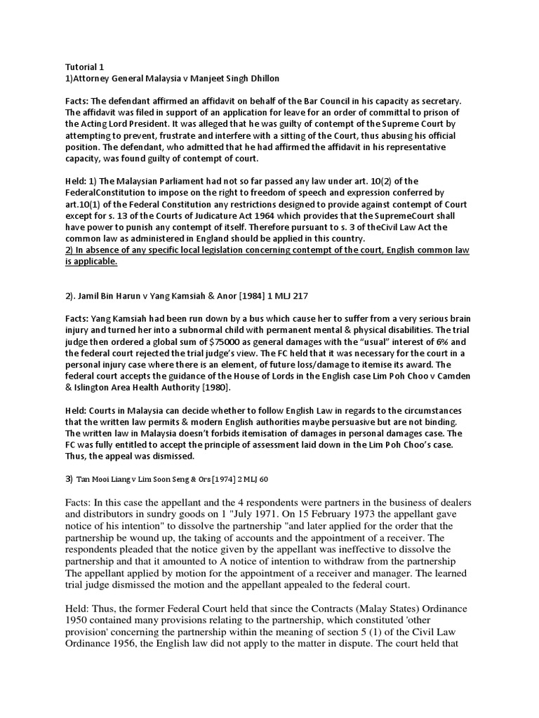 (1) the federation shall be known by the name of persekutuan tanah melayu (in english the federation of malaya). (a) in west malaysia or any part thereof, apply the common law of england and the rules of equity as administered in england on the 7th day of april with the aid of these provisions, english law has often been referred to for guidance in resolving legal dilemmas in the field of insurance law and since. It sharpens your mind and strengthens your understanding of the tuition fees: 1.0introduction in malaysia, the law is commonly derived from the english law which compromises of local law and laws of england which includes legislation, common law and rules of equity, and was applied in malaysia through the doctrine of reception. Although there are some local who are not agree.