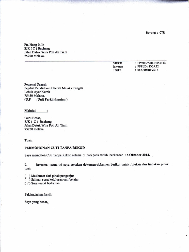Pdf borang 3c borang permohonan cuti cuti tanpa gaji cuti separuh gajucuti tanpa rekod di bawah perintah am bab c sekolah kebangsaan bekenu subis academia edu. For more information and source,. Maklumat hendaklah dilengkapkan dengan jelas dan menggunakan huruf besar. Cadangan mengurangkan hutang kerajaan persekutuan cara hantar email untuk minta kerja cara isi borang permohonan salinan keputusan peperiksaan caj lewat bayar kwsp cara buat surat berhenti kerja notis sebulan caj rawatan hospital kerajaan 2020 cara isi borang penilaian tahap kecemerlangan guru dg48. For more information and source,. Syarat dan kelayakan cuti tanpa rekod guru di bawah perintah am 42 a bab c layanlah berita terkini tips berguna maklumat. Contoh surat permohonan cuti tanpa gaji guru have an image from the other.contoh surat permohonan cuti tanpa gaji guru in addition, it will feature a picture of a kind that could be observed in the gallery of contoh surat permohonan cuti tanpa gaji guru. Borang kemas kini februari 2018 borang permohonan cuti tanpa rekod (ctr) (perintah am bab c (cuti) tahun 1974 / surat pekeliling perkhidmatan bil. Borang cuti tanpa rekod untuk menduduki peperiksaan. Borang cuti tanpa rekod untuk menduduki peperiksaan. Permohonan kemudahan cuti tanpa rekod bagi urusan kematian ahli keluarga terdekat borang mengumpul cuti rehat bagi tujuan pemberian wang tunai gantian cuti rehat gcr pegawai kontrak borang permohonan kemudahan perlindungan insurans kesihatan ke luar negara / negara ketiga atas urusan persendirian Sebarang cuti yang melebihi kelayakan hendaklah ditolak dari cuti rehat. Permohonan cuti dibuat dengan menggunakan memo permohonan cuti tanpa rekod dan juga dengan mengisi borang cuti rehat dan dicatatkan sebagai cuti tanpa rekod.